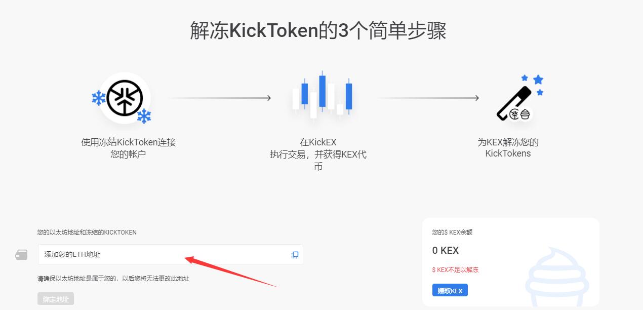 2、打开https://kickex.com/登录,点击“Kicktoken解冻”绑定你的ETH地址